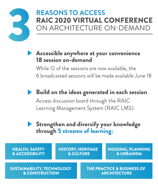 Join your colleagues and peers in a virtual learning and networking experience. The RAIC Virtual Conference on Architecture brings together professionals at every stage in their career to learn, explore, and discuss the challenges and opportunities facing the practice. The virtual program offers eighteen hours of structured learning in a flexible format. Participants will learn from industry-leading experts through educational sessions on a diverse range of topics. While 12 of the sessions are now available, the 6 broadcasted session will be made available June 18.