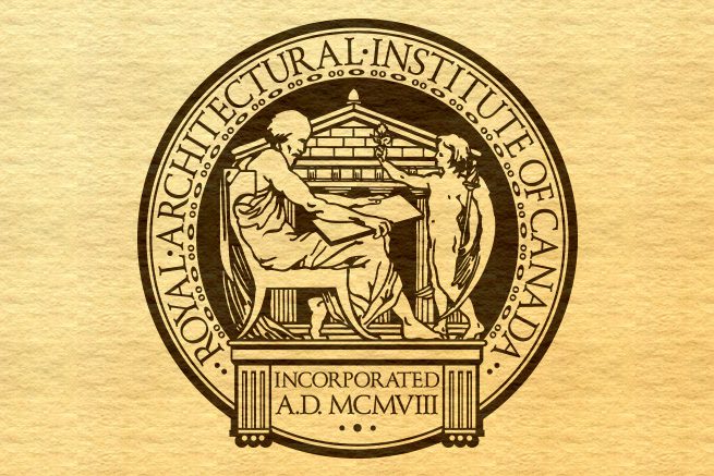 Archival information suggests that the current RAIC seal represents Vitruvius, a Roman architect and writer who lived in the first century BC. Vitruvius believed that good architecture should embody three qualities: firmitatis (strength), utilitatis (functionality), and venostasis (beauty). In the image, Vitruvius is being given a bouquet of flowers by an angel.