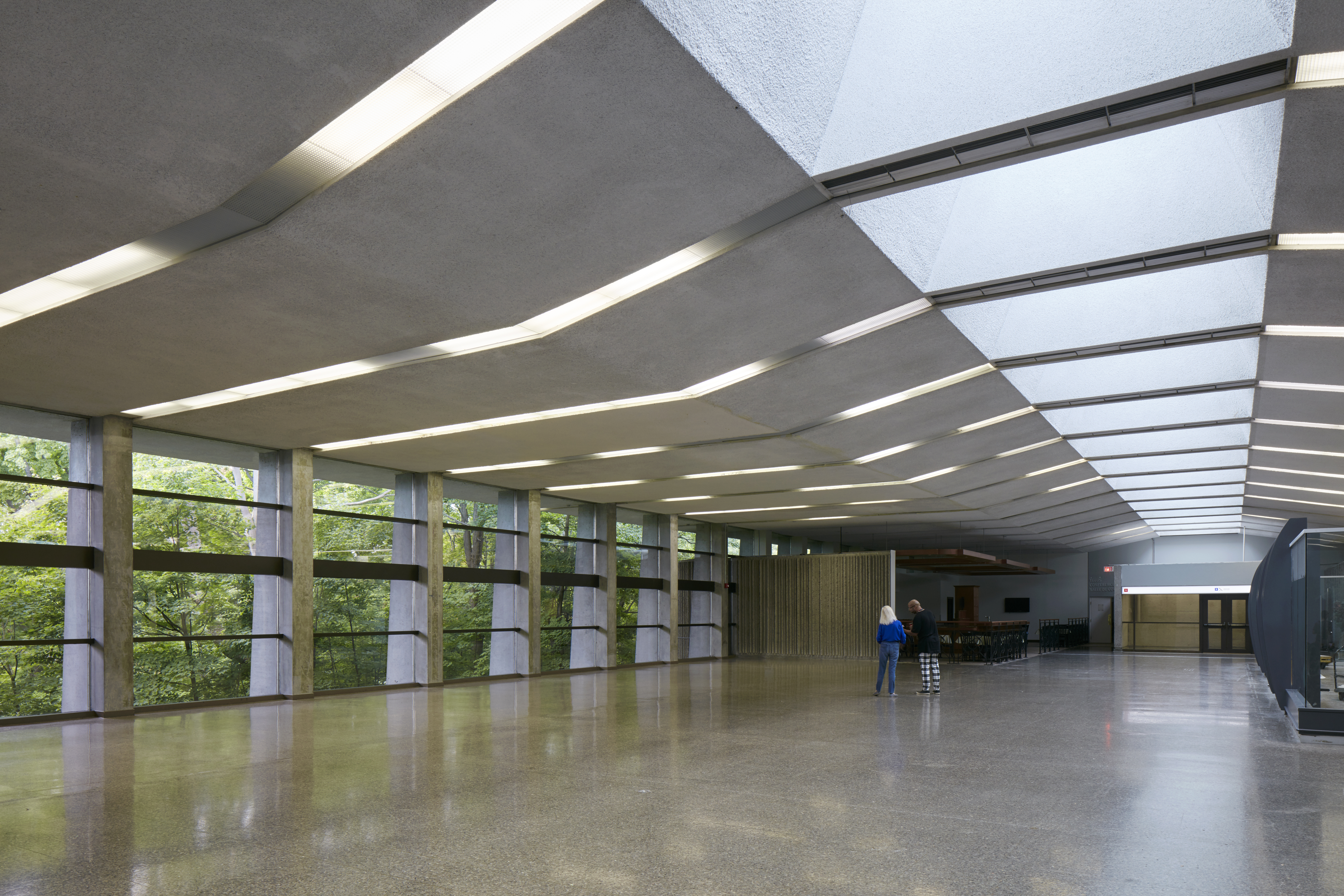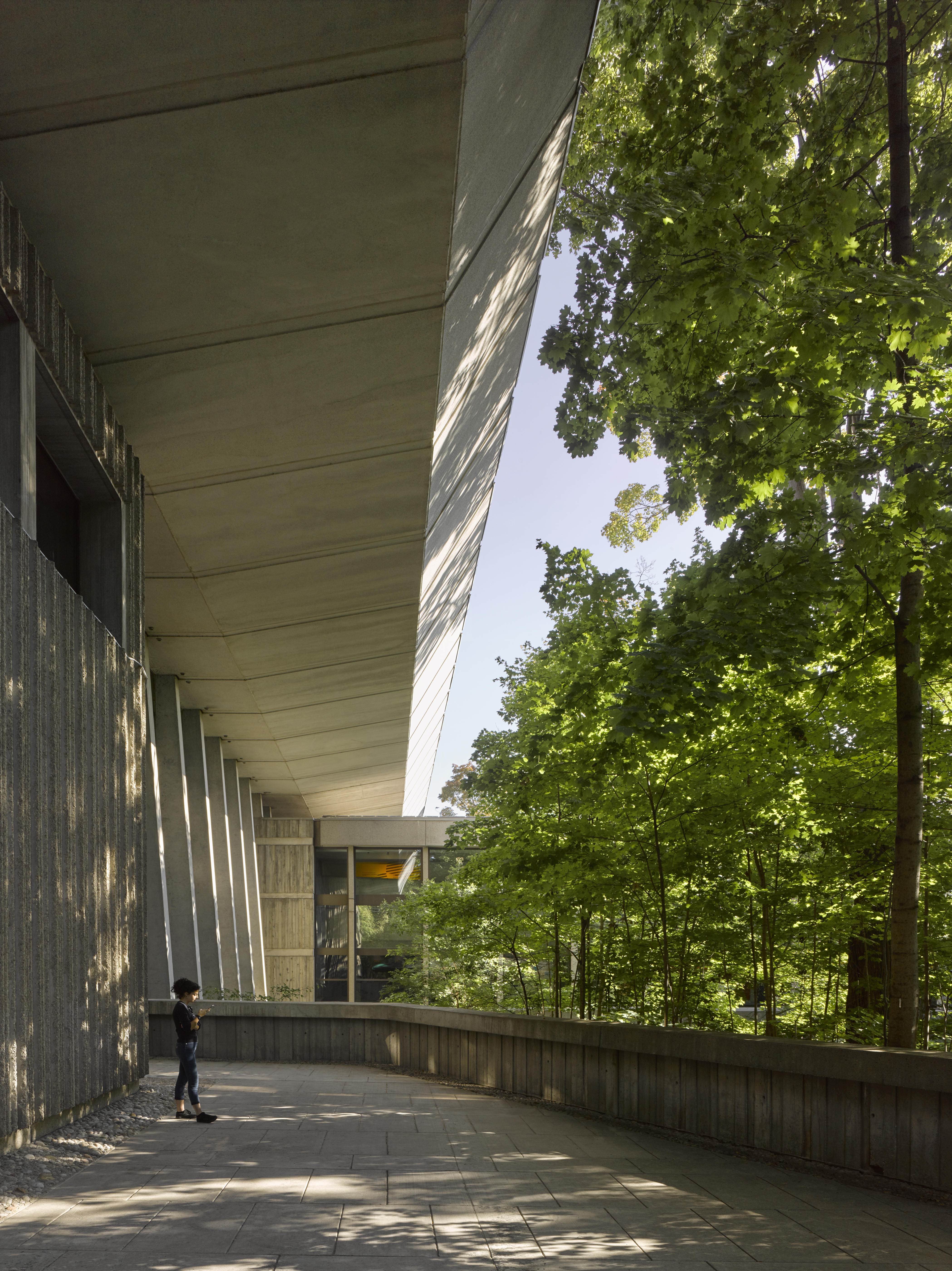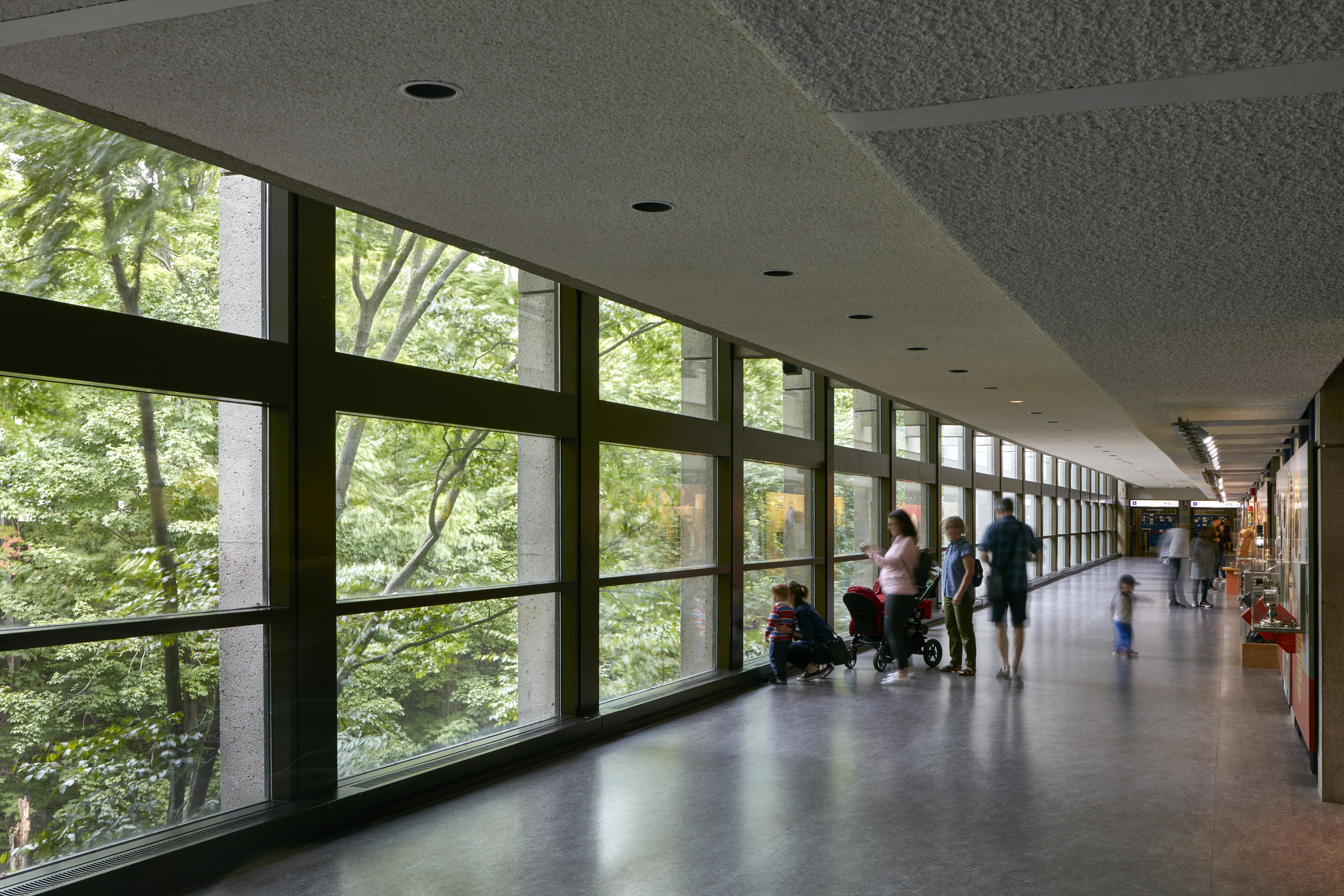 millions of young Canadians. Designed by Raymond Moriyama (1929-2023), the acclaimed Japanese Canadian architect who went on to earn the RAIC’s Gold Medal in 1997, the centre’s quiet strength derives from Moriyama’s interest in eastern philosophy. From the entrance (substantially renovated in 1996 with the addition of an IMAX theatre) visitors cross a soaring bridge before entering a series of trefoil shaped galleries that guide visitors down into the ravine below. The centre’s architecture unfolds over what Moriyama calls a “seven-stage sequence of experience,” meant to psychologically prepare visitors as they move from the mundane to the fantastical, with opportunities for quiet breaks and contemplative views between. Not a few parents have been bemused to watch the piercing mania of rainy-day weekends and school trips give way to mesmeric gazing, as children ride silently aboard escalators and look out over the forest floor.