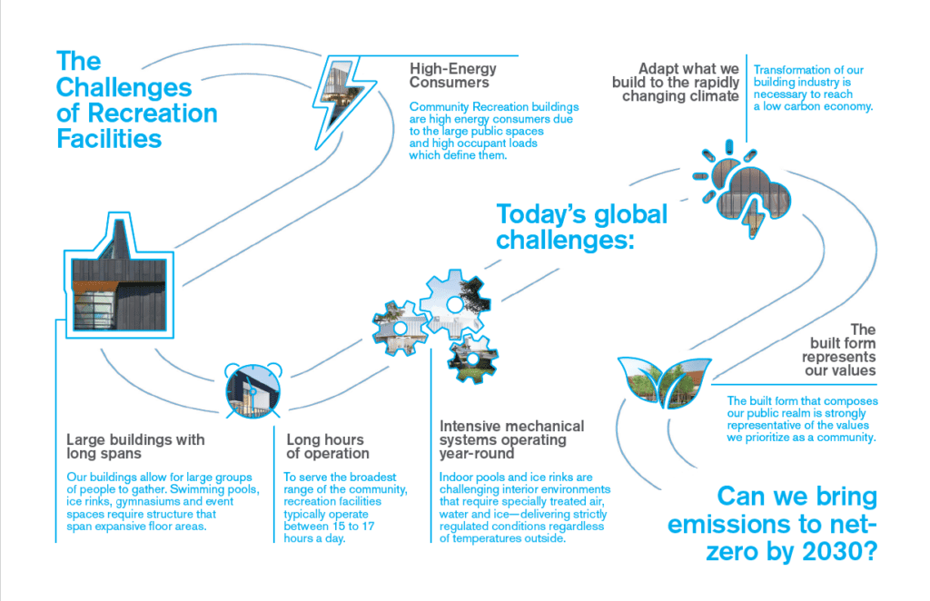 The Western North York Community Centre (WNYCC) exemplifies the transformative potential of civic architecture used to challenge industry norms. Commissioned by the City of Toronto in 2017, it is Canada’s first Net Zero Energy aquatic facility. Integrating groundbreaking strategies to address energy-intensive recreational buildings, the facility incorporates several firsts for the city to radically reduce energy demand, making 100% offset from on-site renewable energy and a tight site possible.