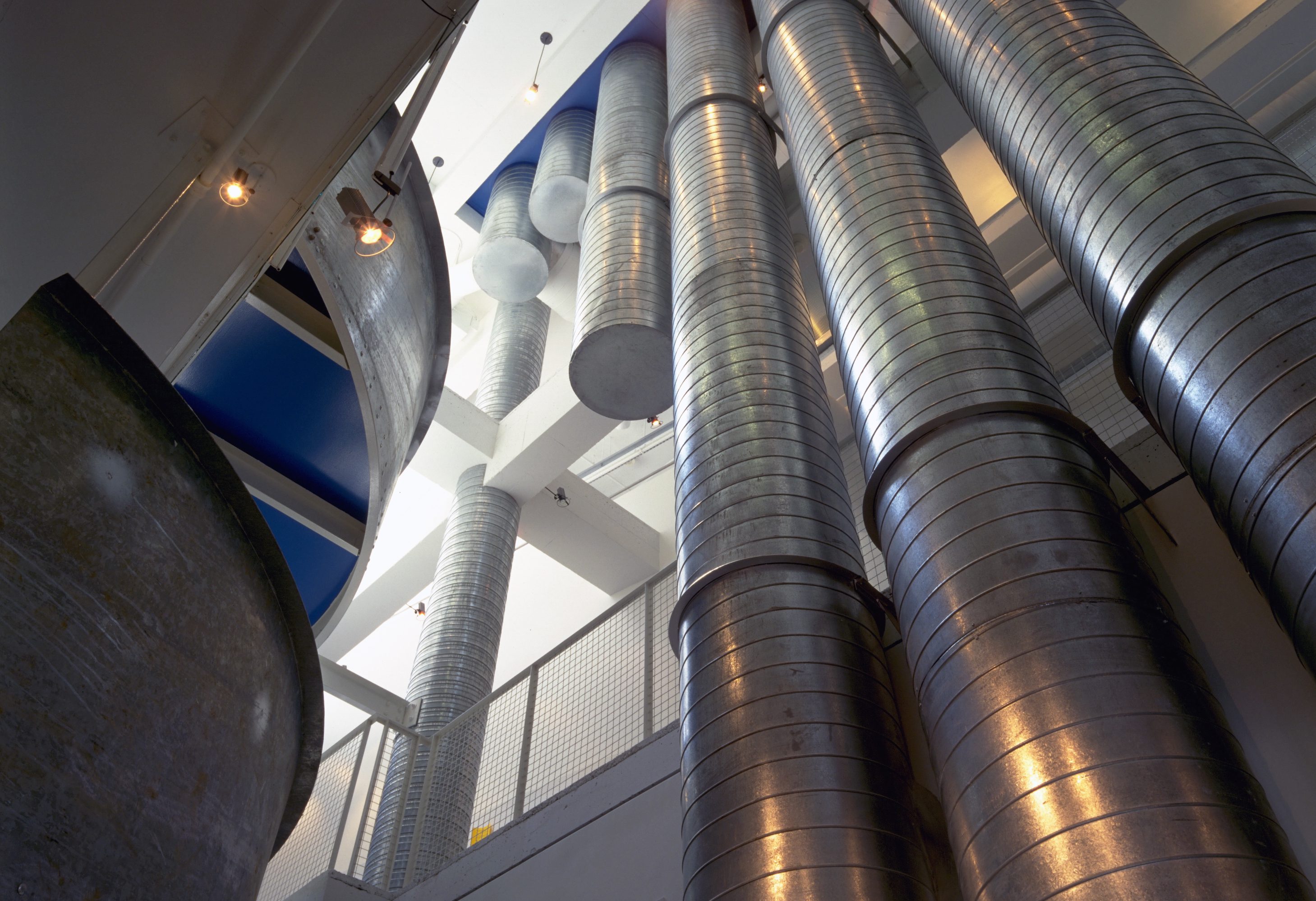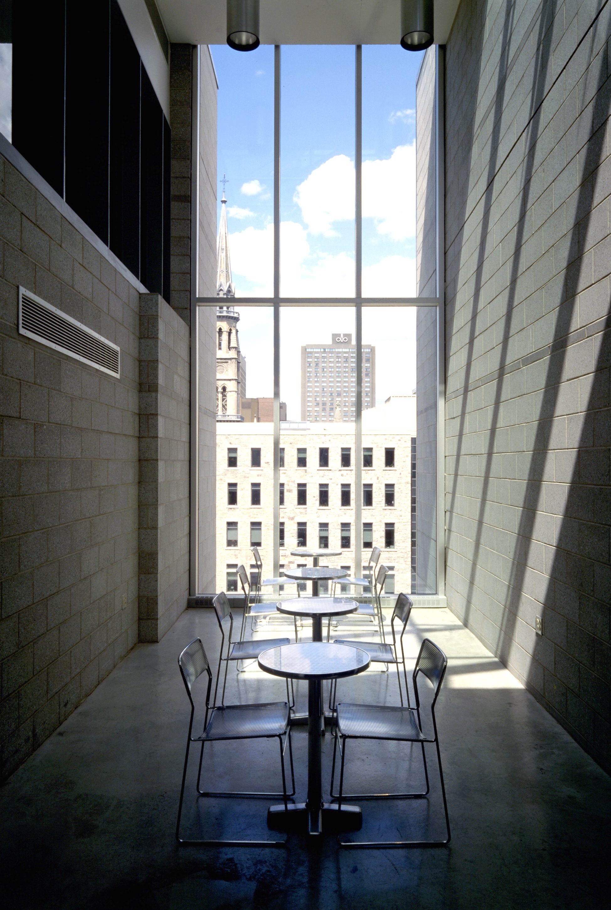 Le pavillon de design de l’Université du Québec à Montréal (UQAM)de Hanganu occupe un angle de rue avec une présence affirmée, mettant en valeur le béton coulé, le bloc de béton personnalisé, le coffrage métallique et le verre. Un plan en L, composé d’ailes de la longueur d’un îlot, encadre 11 000 mètres carrés consacrés à une immersion dans des disciplines allant de l’architecture au graphisme. Le parti architectural fusionne sans doute les « Cinq points de l’architecture moderne » de Le Corbusier (1926) et la distinction entre espaces servants et espaces servis développée par l’architecte américain Louis Kahn après la Seconde Guerre mondiale. Un hall d’entrée spectaculaire de quatre étages, comprenant une galerie d’exposition au rez-de-chaussée, mène à un escalier monumental emblématique qui se resserre en s’élevant vers un atrium étroit et profond, éclairé par le haut, qui traverse l’école. Des plateaux empilés avec audace, animés par des escaliers en épingle, des paliers en porte-à-faux et des mezzanines saillantes, offrent des vues vertigineuses sur l’énergie créative des étudiants au travail. Le traitement valorisant de matériaux industriels économiques et standard — panneaux de particules teintés, montants apparents, treillis métallique, tôle damier et acier ondulé — se poursuit dans l’équipement de Hanganu : escaliers, garde-corps ou conduits de climatisation imitant les colonnes adjacentes laissées dans des gaines cylindriques, dotés d’une charge ludique. La lumière pénètre de toutes parts. Le résultat est unique : à la fois fonctionnel et poétique, avec une touche surréaliste sans équivalent dans l’architecture contemporaine canadienne.