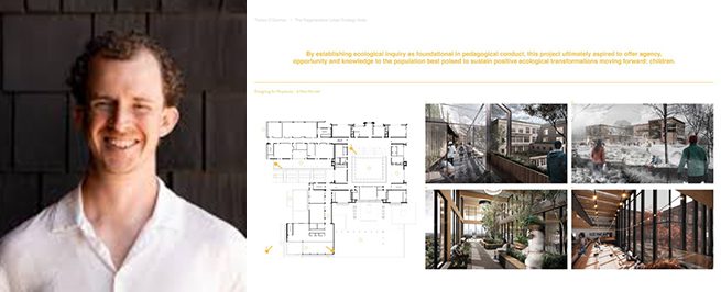 Le projet de thèse de Tristan est réfléchi et réimagine le rôle des écoles, en particulier la manière dont les écoles du district scolaire de Toronto peuvent devenir des pôles d’écologie urbaine. Ce projet considère les architectes et l’architecture comme des agents de changement en intégrant un programme écologique significatif ainsi que des lieux et des espaces que les élèves peuvent explorer et où ils peuvent apprendre. Le travail de Tristan peut être adopté et reproduit par d’autres districts scolaires urbains. L’engagement de la population étudiante est excellent et rappelle à chacun de nous que nous pouvons tous jouer un rôle dans le changement nécessaire.