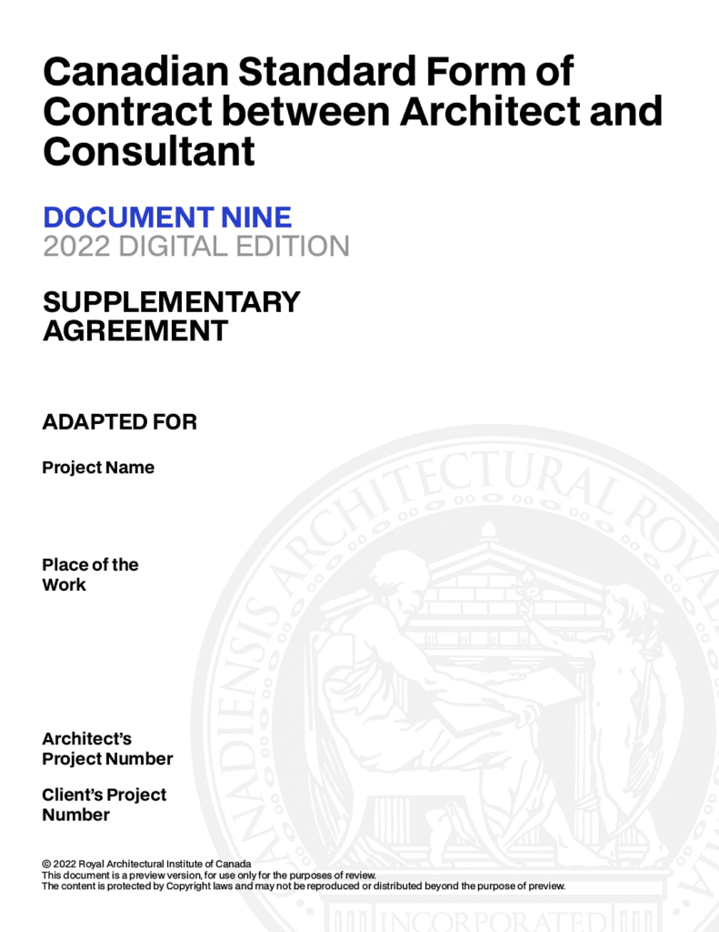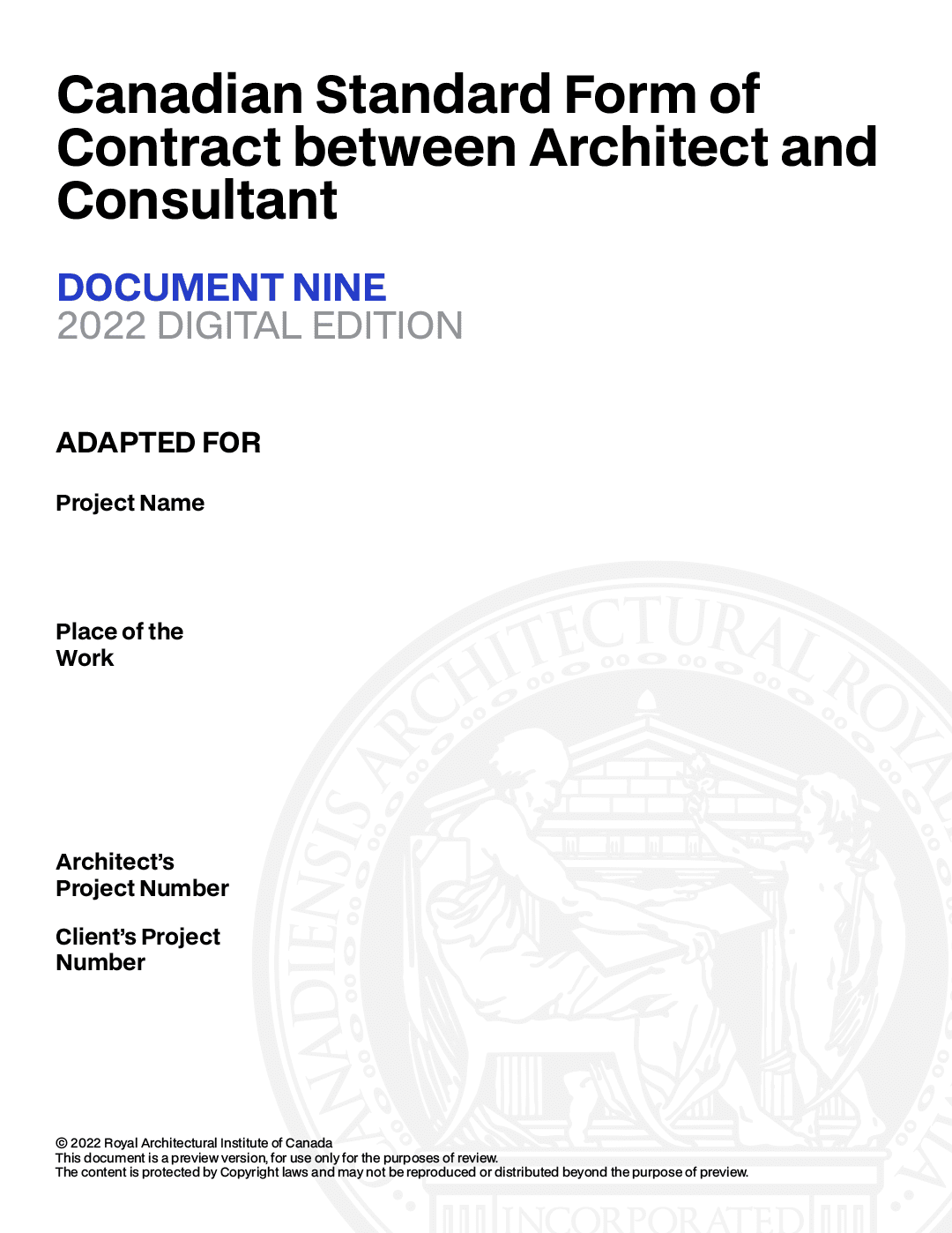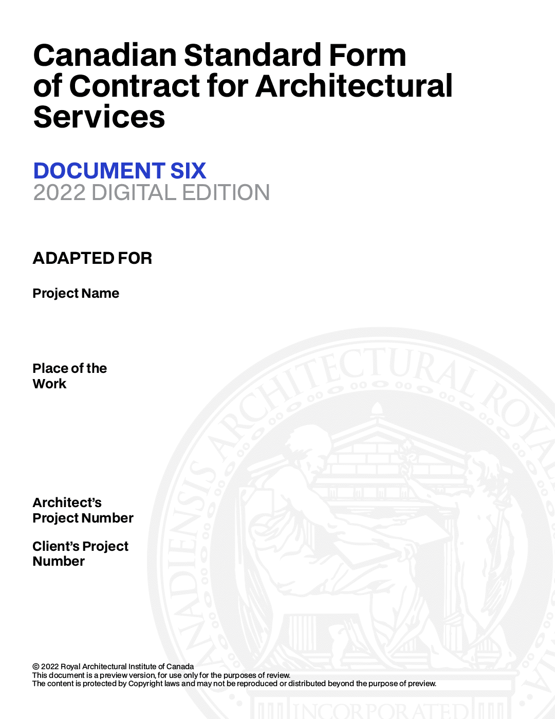 The RAIC prepares specially watermarked versions of the Canadian Standard Form of Contract for Architectural Services – Document Six, and the Canadian Standard Form of Contract between Architect and Consultant – Document Nine for ExAC study purposes.